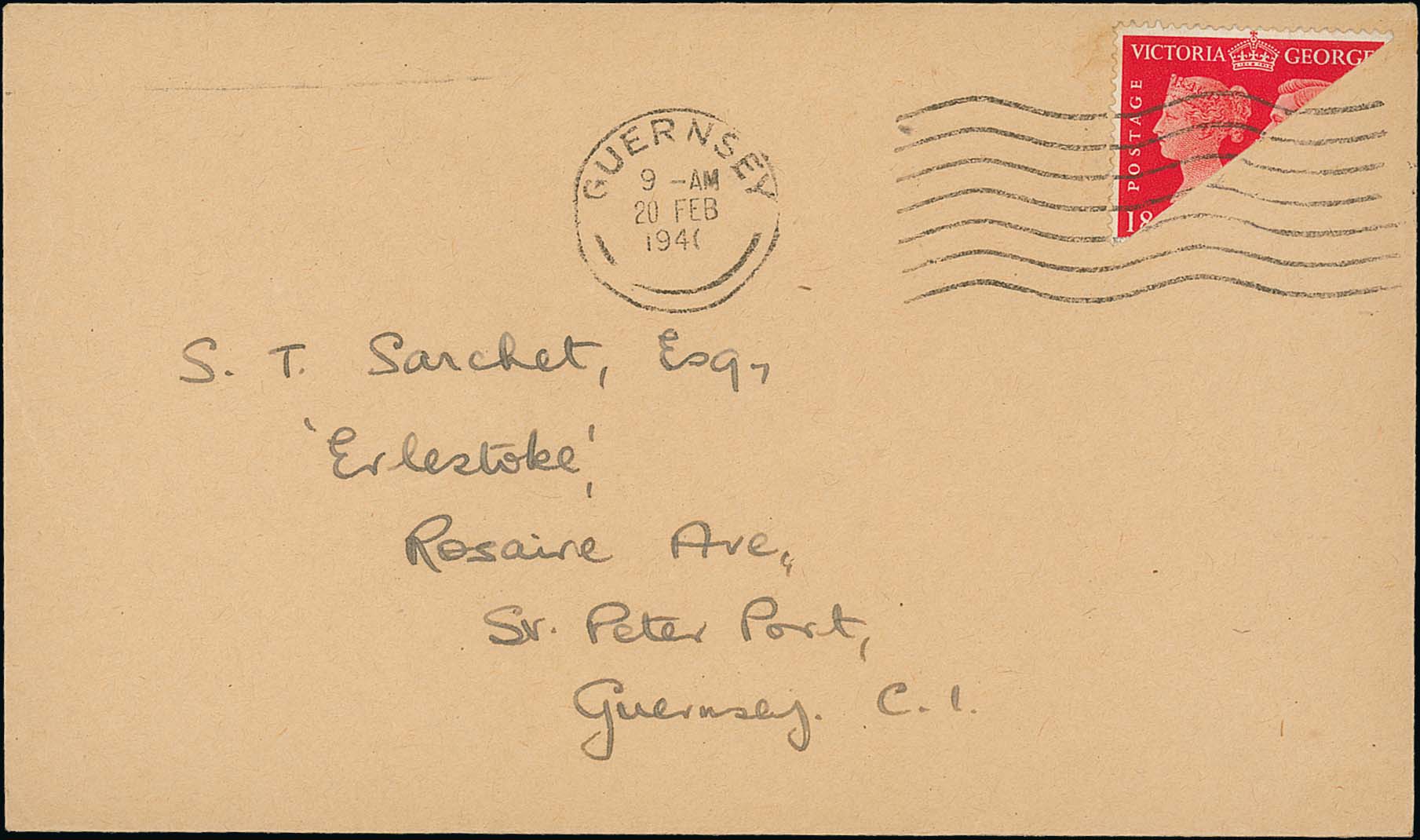 581 imageWW2 Occupation. 1941 (Feb 20) Unsealed cover to St. Peter Port bearing 1940 Penny Postage Centenary 1d diagonally bisected, tied by Guernsey machine. A rare bisect on an apparently commercial cover sent at the printed matter rate. Photo on Page 82. (Image1)