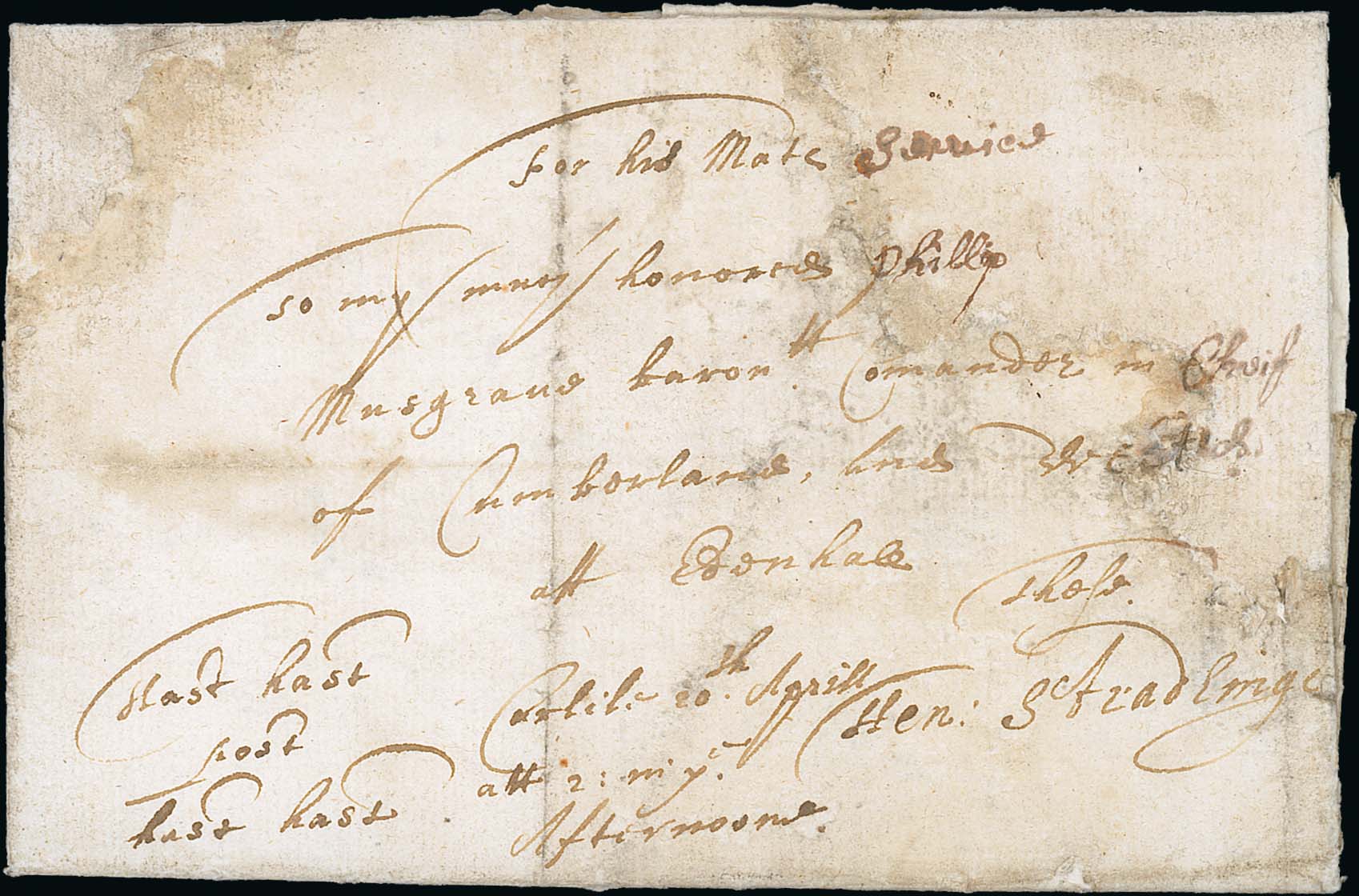584 imageCarlisle - Civil War Haste Post Haste Letter. 1644 (Apr 20) Entire letter from Sir Henry Stradling, Governor of Carlisle Castle, addressed "For his Mate Service, To my very honored Phillip Musgrave baronett, Commander in Chief of Cumberland and West d at Edenhall" and inscribed "Hast Hast Post Hast Hast, Carlisle 20th April at 2 in ye afternoon, Hen. Stradlinge". Some damp faults with repairs at upper corners, some losses to the internal letter, nevertheless a very rare civil way period haste post haste letter, believed to be unique from Carlisle. Stradling joined Charles I after the surrender of Carlisle in 1645, and was captured at Rowton Heath later that year; he took part in royalist revolts in South Wales in 1647 and 1648. An important letter. Photo on Page 82. (Image1)