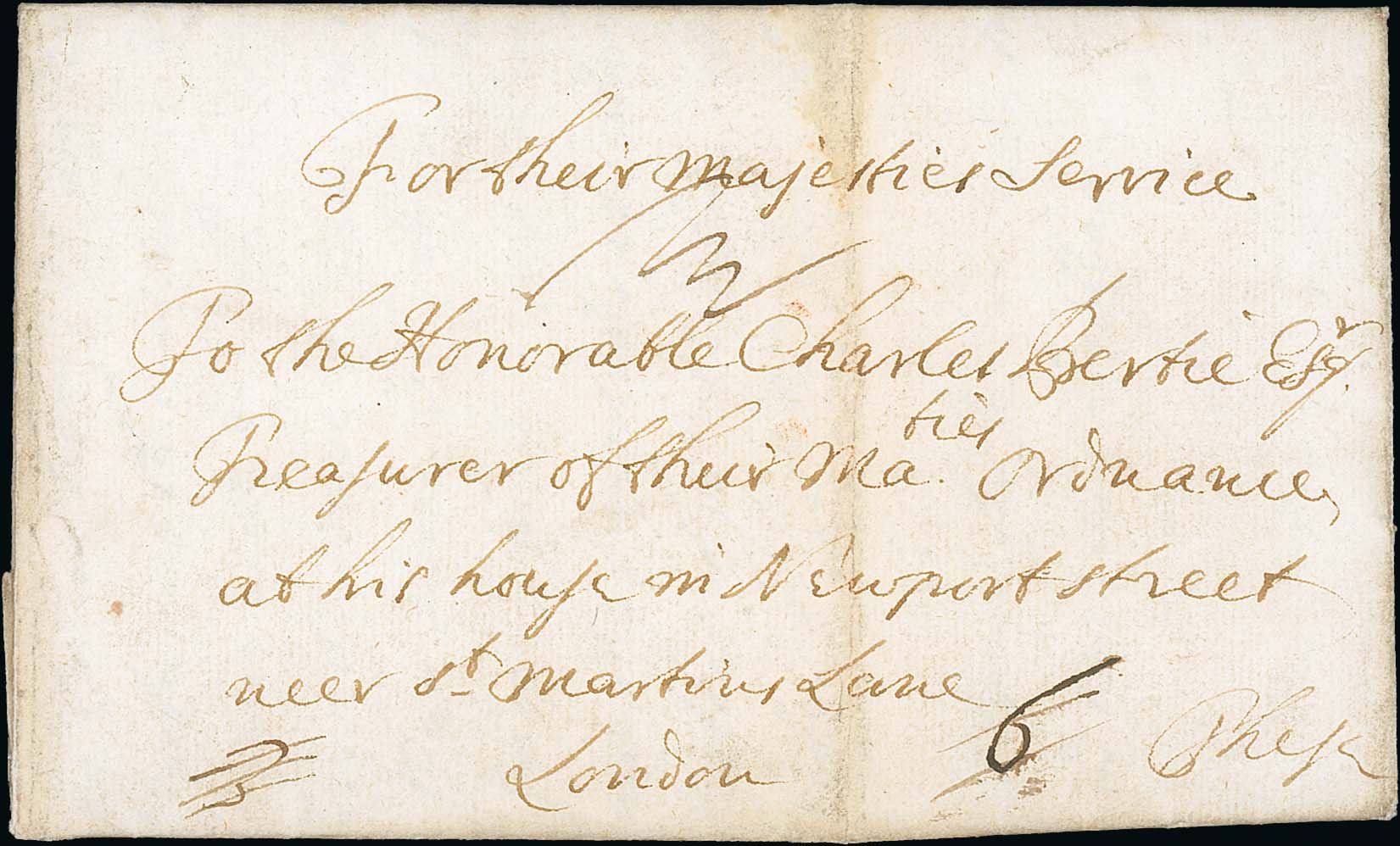 585 imageFrees. 1689 (July 17) Entire letter from the Isle of Wight, written by the Island Governor Sir Robert Holmes, addressed to the Honorable Charles Bertie, Treasurer to their Majesties Ordnance in London, sent during the co-regency of William and Mary so headed "For their Majestys Service" with "3" and "6" charges crossed out and a manuscript squiggle to donate free postage, reverse with "JY/19" Bishop Mark. The interesting contents concern improvements to the island s defences and payment for these works. Ex George Crabb & Frank Bottomley. Photo on Page 82. (Image1)