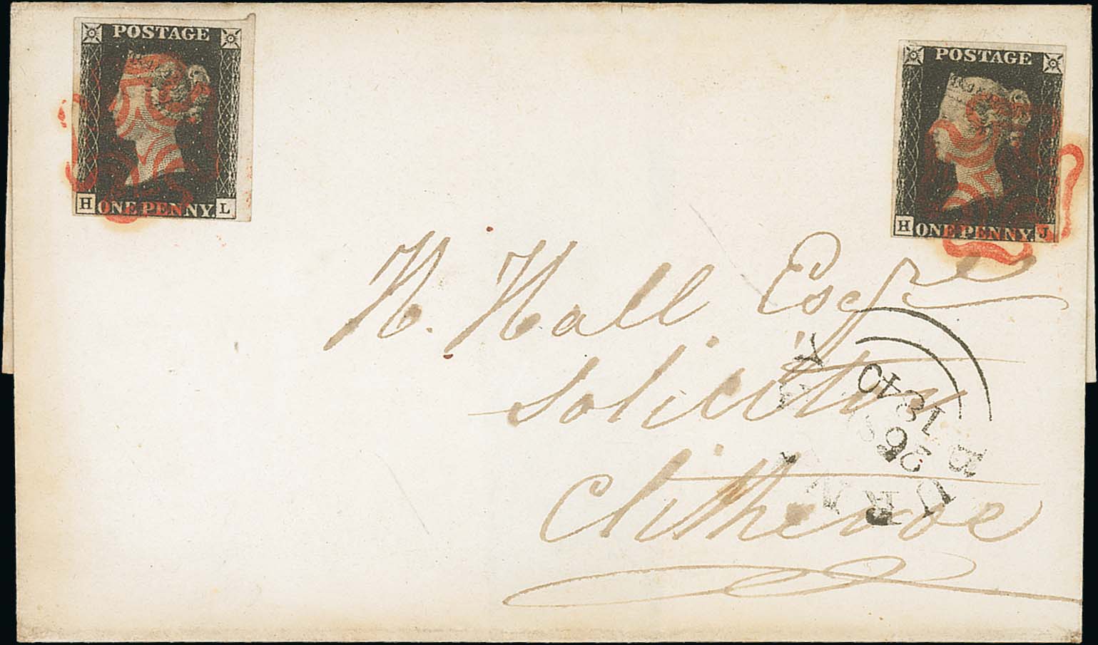 590 image1840 (Sep 26) Entire from Burnley to Clitheroe bearing two 1d blacks (both plate 5) tied by red Maltese Crosses, HJ (just touched at base) in the upper right corner to pay the postage, HL (four margins) in the upper left corner to pay the late fee for posting after 6pm, a Burnley datestamp on the front. A fine and scarce 1d black late fee letter. Photo on Page 82. (Image1)