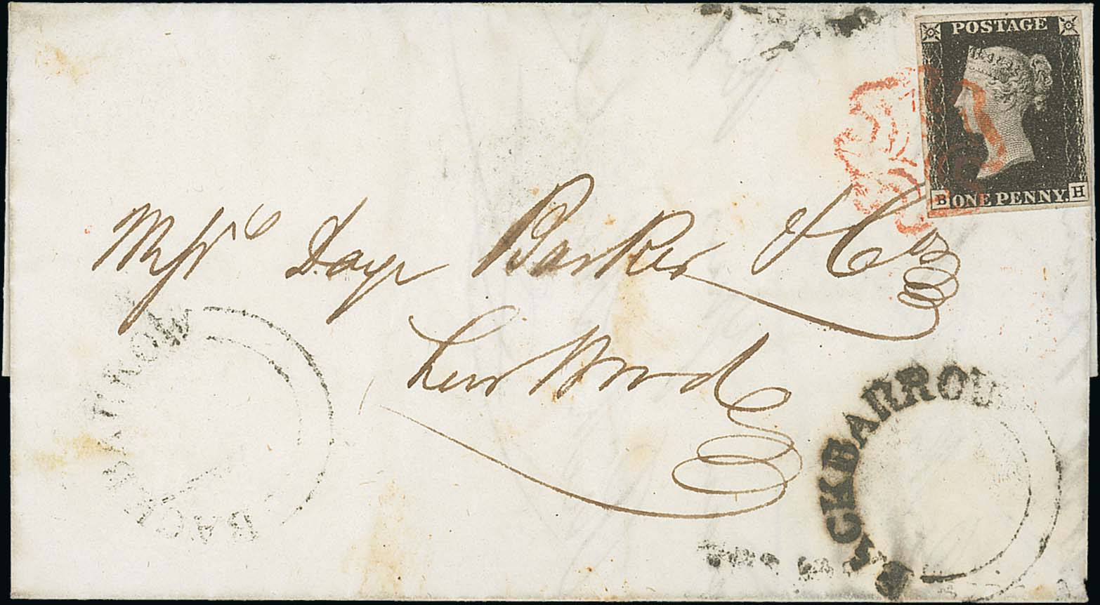 591 image1840 (Oct 22) Entire letter to Low Wood, written at Ulverston but posted at Backbarrow, franked by a 1d black, BH plate 6 with four good margins, tied by a fine orange Maltese Cross with matching Ulverston backstamp, a "BACKBARROW" undated circle below the stamp. A scarce and unusual use of a 1d black from a small village office, with a fine orange cancel. Photo on Page 82. (Image1)