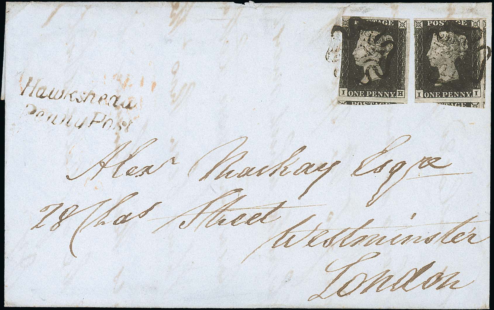 592 image1841 (Sep 10) Entire letter from Hawkshead to London, the 2d double rate paid by two plate 4 1d blacks, IH (touched at left) and II (four margins) each tied by a black Maltese Cross, "Hawkshead / Penny Post" on the front, backstamped at Ambleside and London. A fine 1d black cover with a Penny Post handstamp. Photo on Page 84. (Image1)