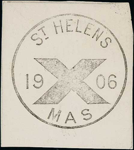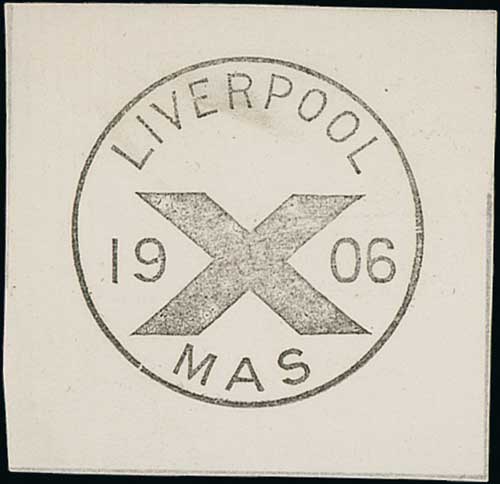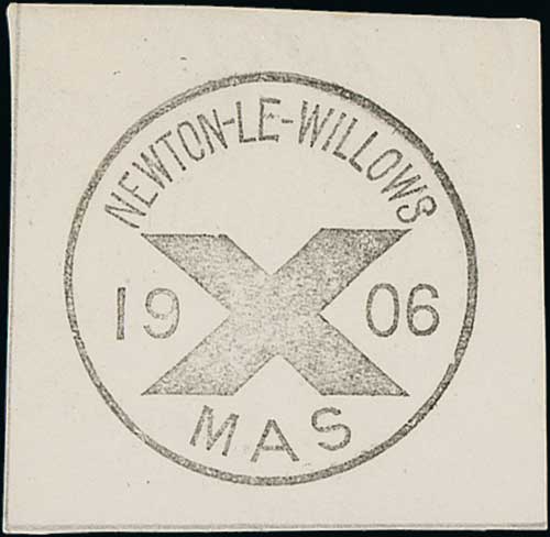 593 image1906 Proof impressions of "X/MAS" handstamps for Liverpool, St. Helens and Newton-le-Willows on pieces, the last two with partially printed details of the handstamp manufacturer on the reverse, apparently reading "George Lucy, Sole Engravers & Stamp Cutters to His Majestys Post Office". Probably unique. (3). Photo on Page 32. (Image1) (Image2) (Image3) (All Images)