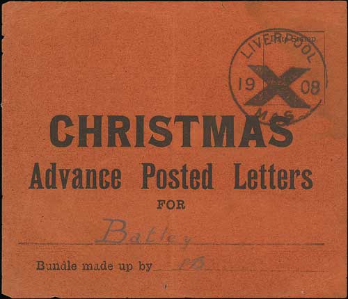 596 imageLiverpool. 1908 Printed bundle label on red paper "CHRISTMAS / Advance Posted Letters / FOR / (Batley)" with a fine Liverpool "X / MAS" handstamp, unusual and scarce. Photo on Page 84. (Image1)