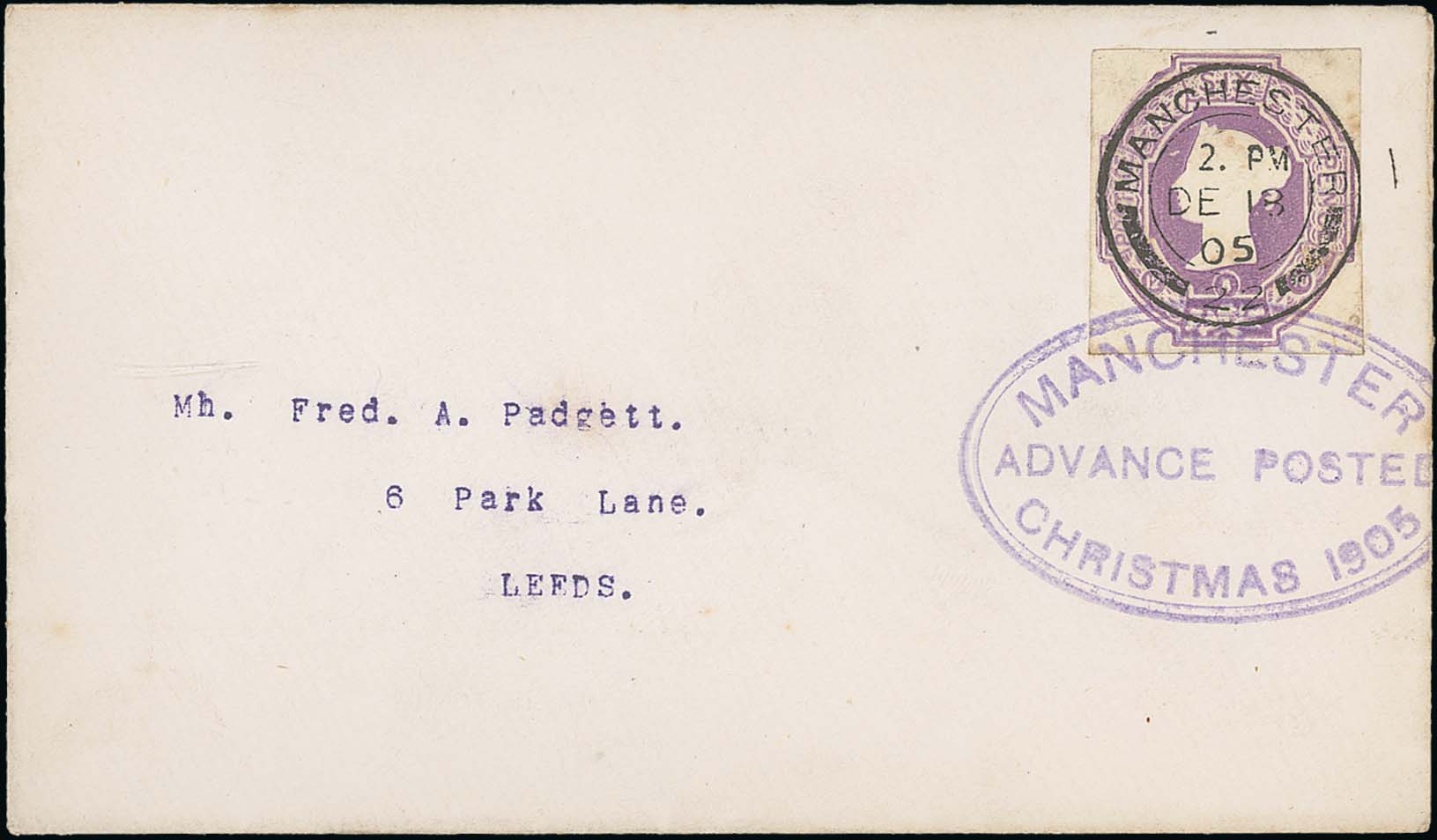 597 imageManchester. 1905 (Dec. 18) Cover posted from Manchester to Leeds with QV 6d envelope stamp cut-out tied by Manchester c.d.s, arrival backstamp, the stamp then tied by a superb strike of the violet oval "MANCHESTER / ADVANCE POSTED / CHRISTMAS 1905", presumably cancelled to order, nevertheless a scarce cancel and very unusual. Photo on Page 84. (Image1)