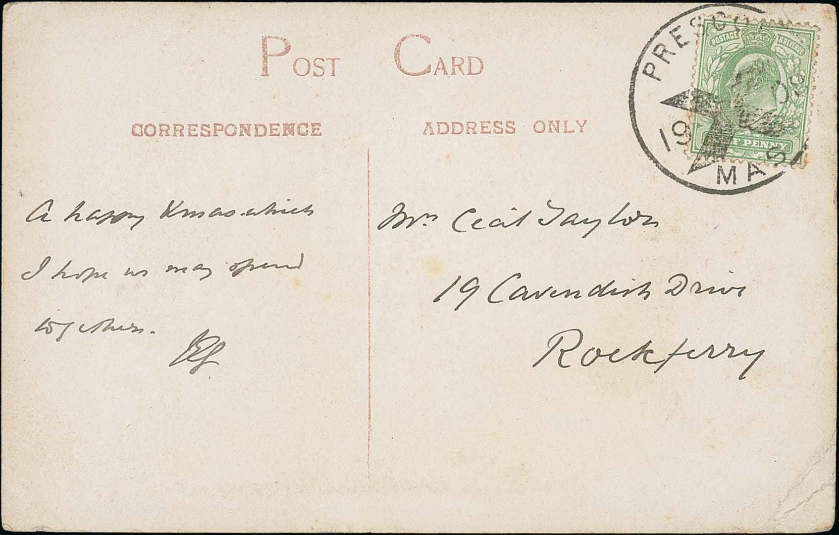 598 imagePrescot. 1908 Picture postcard to Rockferry, a KEVII ½d tied by "X / MAS" cancel, corner crease, otherwise fine and scarce, also KEVII 1d on piece with 1907 cancel. Just 3,200 items posted in 1906, 1,500 in 1907, the postcard with R.P.S Certificate (1986). (2). Photo on Page 84. (Image1)