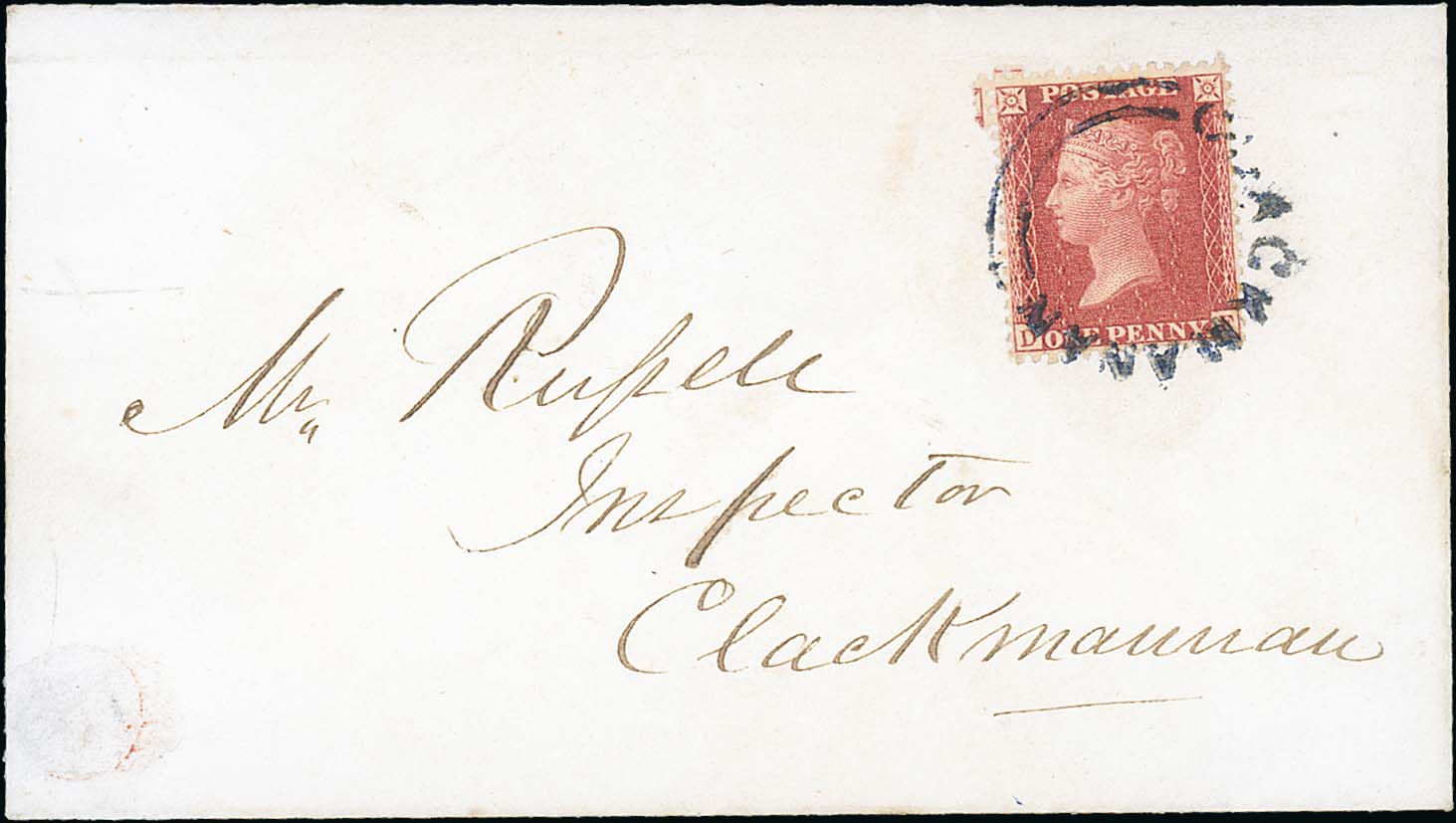 637 imageClackmanan. c.1857 Cover sent locally within Clackmanan with a 1d red tied by the undated circular "CLACKMANAN" in blue, also an entire to Paisley with the blue undated circle on reverse and the 1d red cancelled at Stirling. A very scarce local handstamp used as a cancellation. (2). Photo on Page 86. (Image1)