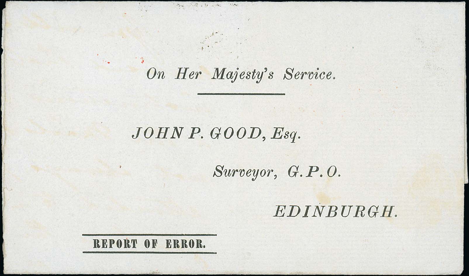 643 imageGreenock - Error Report. 1847 "Report of Error" form with printed O.H.M.S address to "John P Good, Surveyor, G.P.O Edinburgh", completed by the Greenock Postmaster with Greenock and Edinburgh backstamps. The Rothesay and Dunoon mail bags have been received from the Royal Mail Steam Packet "Castle" soaked with rain so the contents were much mutilated and the addresses barely readable, something that frequently occurs due to the steam packet not placing the bags into the box provided. An unusual and unique Post Office form sent free of charge. Photo on Page 86. (Image1)