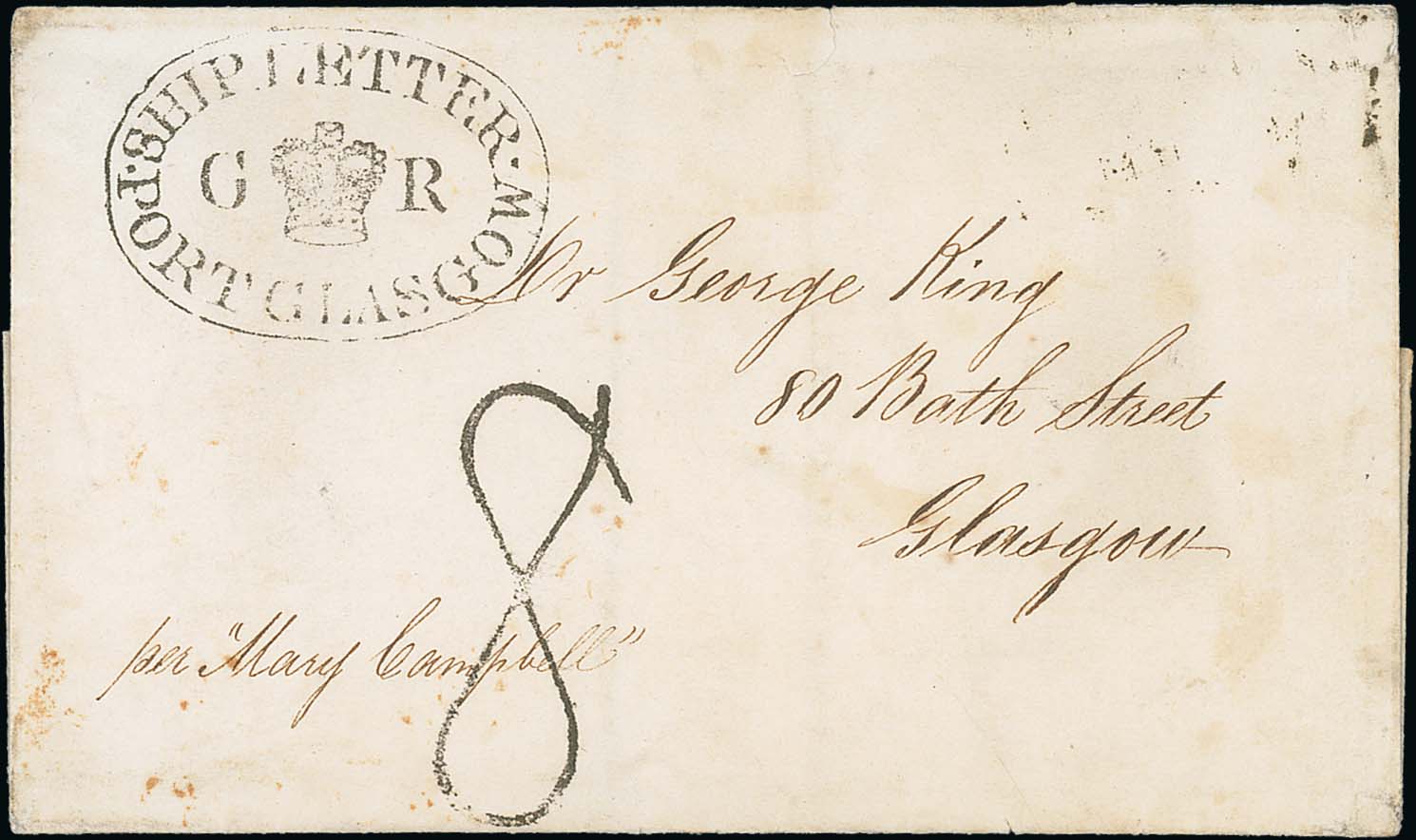 679 imagePort Glasgow. 1840 Entire to Glasgow "per Mary Campbell", red Mauritius backstamp, superb oval "SHIP LETTER / G (crown) R / PORT GLASGOW" (S6) and the scarce handstruck "8" charge mark. Photo on Page 92. (Image1)