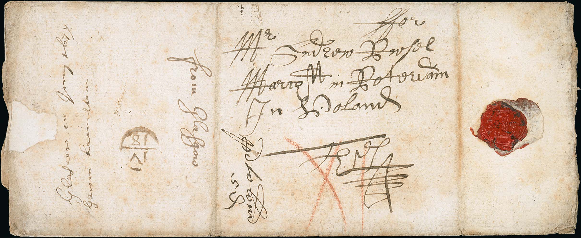 698 image1682 (July 6) Entire letter to Rotterdam, the reverse with "Glasgow" Post Office endorsement and a "JY/19" London Bishop Mark, the front endorsed "Post Pd to London" with "5d" added in a second hand, red "XI" Stuivers charge, early and scarce. Photo on Page 92. (Image1)
