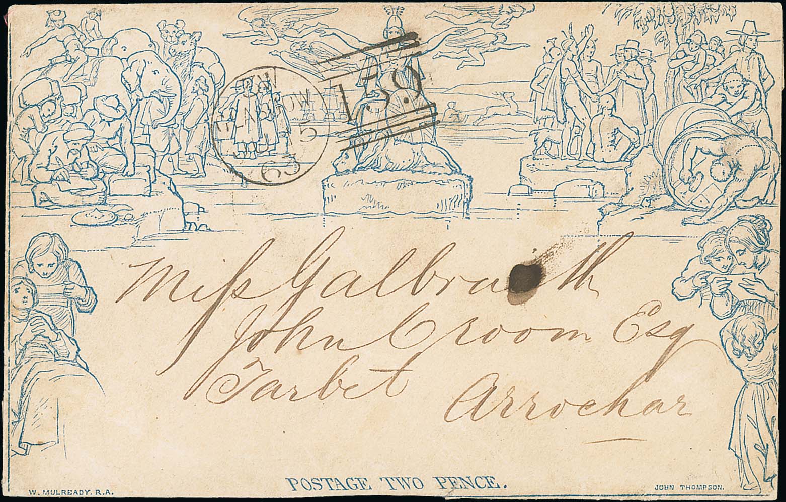 726 imageMulready. 1863 (June 15) 2d Mulready envelope stereo a199 to Arrochar, Britannia cancelled by a Glasgow 159 duplex, arrival backstamp, ink smudge on address and a few flap faults, otherwise fine, an exceptionally late and scarce use of a 2d Mulready envelope. Photo on Page 100. (Image1)