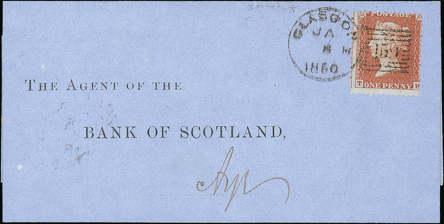745 Newspapers/Printed Matter. 1823-94 Newspapers (2), entires and wrappers (17) with 1823 "Edinburgh Gazette" handstamped boxed "TONTINE / COFFEE ROOM / GLASGOW"; 1854 (Dec 23) "North British Daily Mail" bearing a red 1d newspaper stamp but posted in January 1855 (after newspaper stamps ceased to be valid for postage) and therefore franked by a 1d red cancelled "159" with Glasgow eight sided datestamp; and various oval or circular N.P.B cancels, or triangular "GW". (19).