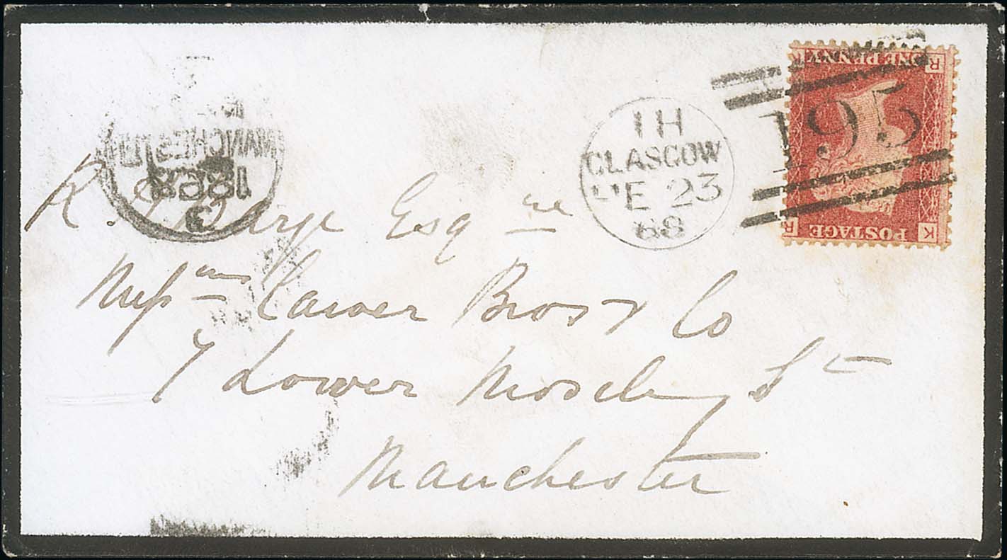 731 imageDuplex Error. 1868 (Feb 23) Cover franked 1d to Manchester cancelled by Glasgow 195 duplex with error of number "195" for "159", only recorded for a few days in February 1868, very scarce. Photo on Page 100. (Image1)