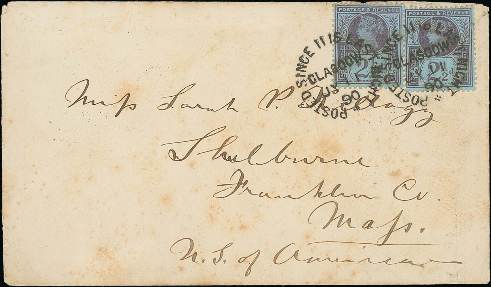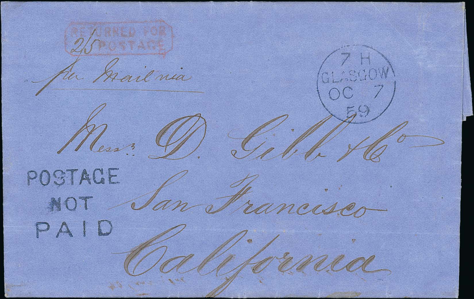 750 imagePostage Due Mail. 1859 (Oct 6) Stampless entire to San Francisco with blue Glasgow c.d.s and unframed "POSTAGE / NOT / PAID", small red boxed "RETURNED FOR / 2/5 POSTAGE", backstamped at Edinburgh, very unusual and scarce. Photo on Page 102. (Image1)