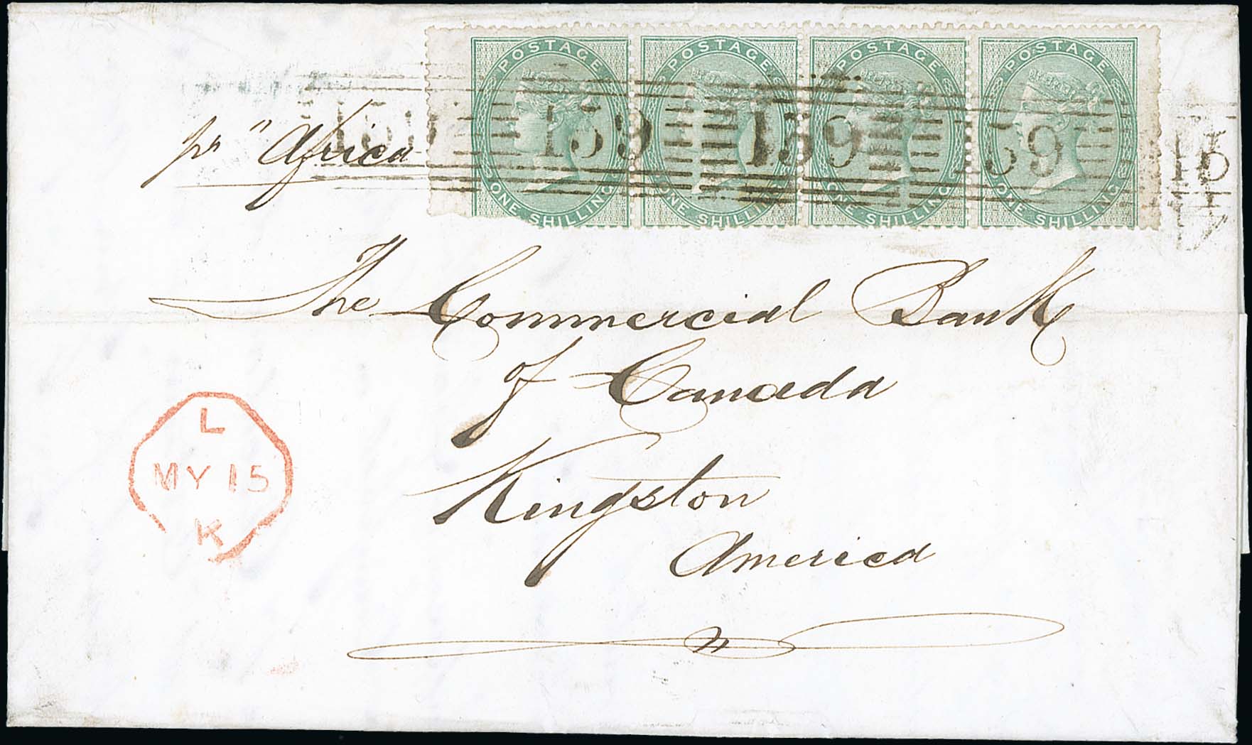 733 imageRoller Cancels. 1857-60 Entire letters and covers with "159" roller cancels, internal covers franked 1d (4) or 4d (2), and an entire letter to Canada "pr Africa" franked 1/- strip of four (fault to left stamp), the last exceptionally unusual. (7). Photo on Page 100. (Image1)