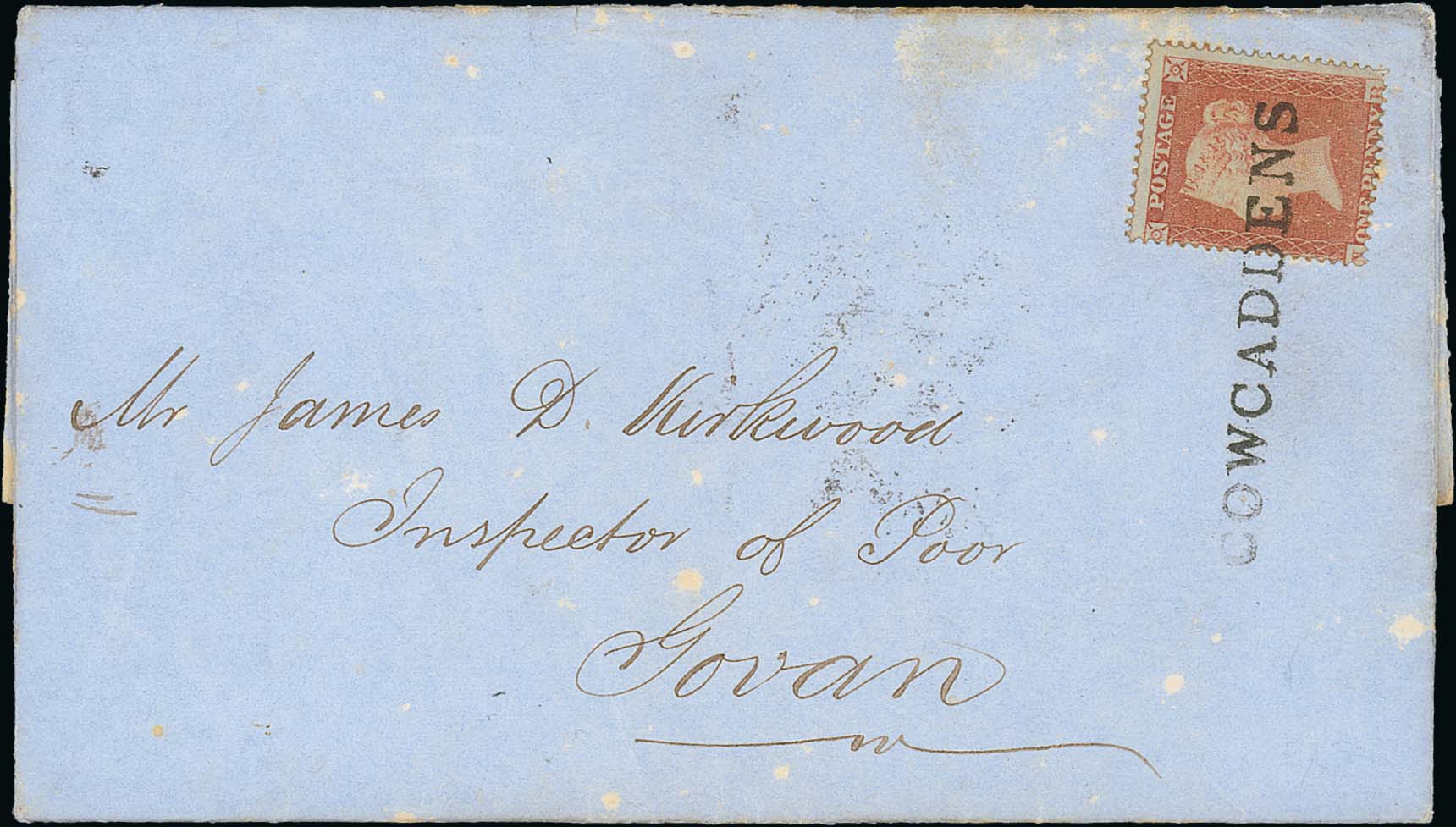 734 imageScots Local Cancels. 1854-59 Entire letters and covers bearing 1d reds and a 1d envelope, the display collection showing all types of cancel used in and around Glasgow, all fine selected strikes including straight line "Cowcaddens", straight line handstamps between bars (6, Cambuslang, Rutherglen, Lochwinnoch, Newton Mearns, Kinning Place, Whitevale), "Govan Govan" with two bars above and below, italic "The Cross" and "St. Rollox" with two bars above and below, boxed handstamps (17, with Old Kilpatrick, Anderston, Cowcaddens, Pollockshaws, Q.S Station, Gallowgate W.O), circular handstamps (6, Govan, Muddiesburn, Stevenston, Neilston, Milton, Tollcross), a fine lot. (33). Photo on Page 100. (Image1)