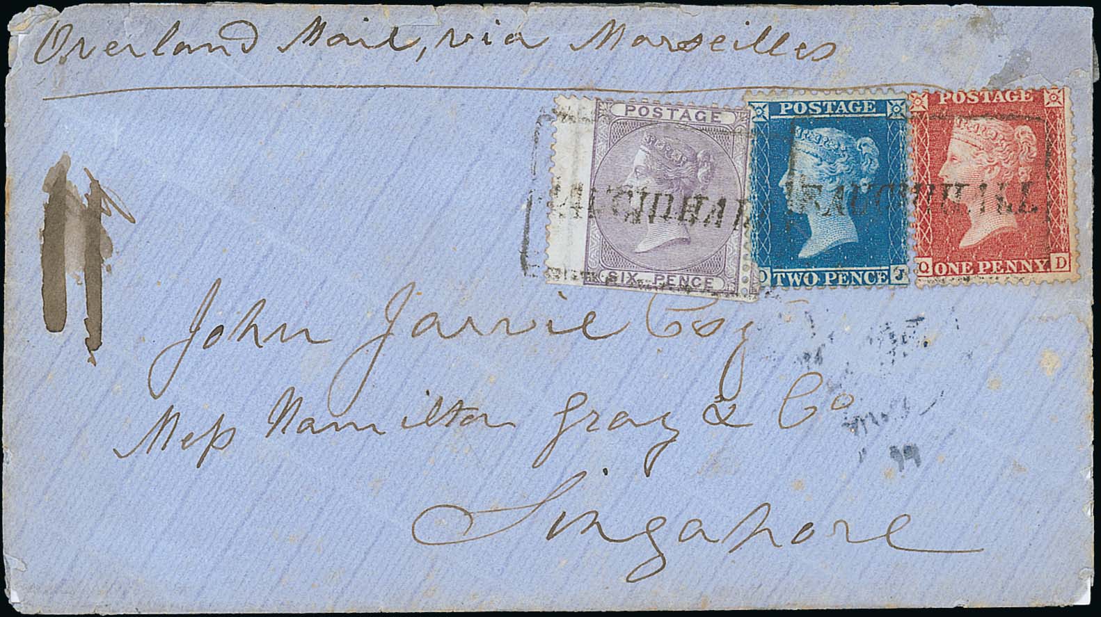 738 imageScots Local Cancels. 1857 (Jan 23) Cover to Singapore franked 1d + 2d + 6d cancelled by two strikes of boxed "SAUCHIHALL", Glasgow and London backstamps, very attractive and unusual. Photo on Page 100. (Image1)