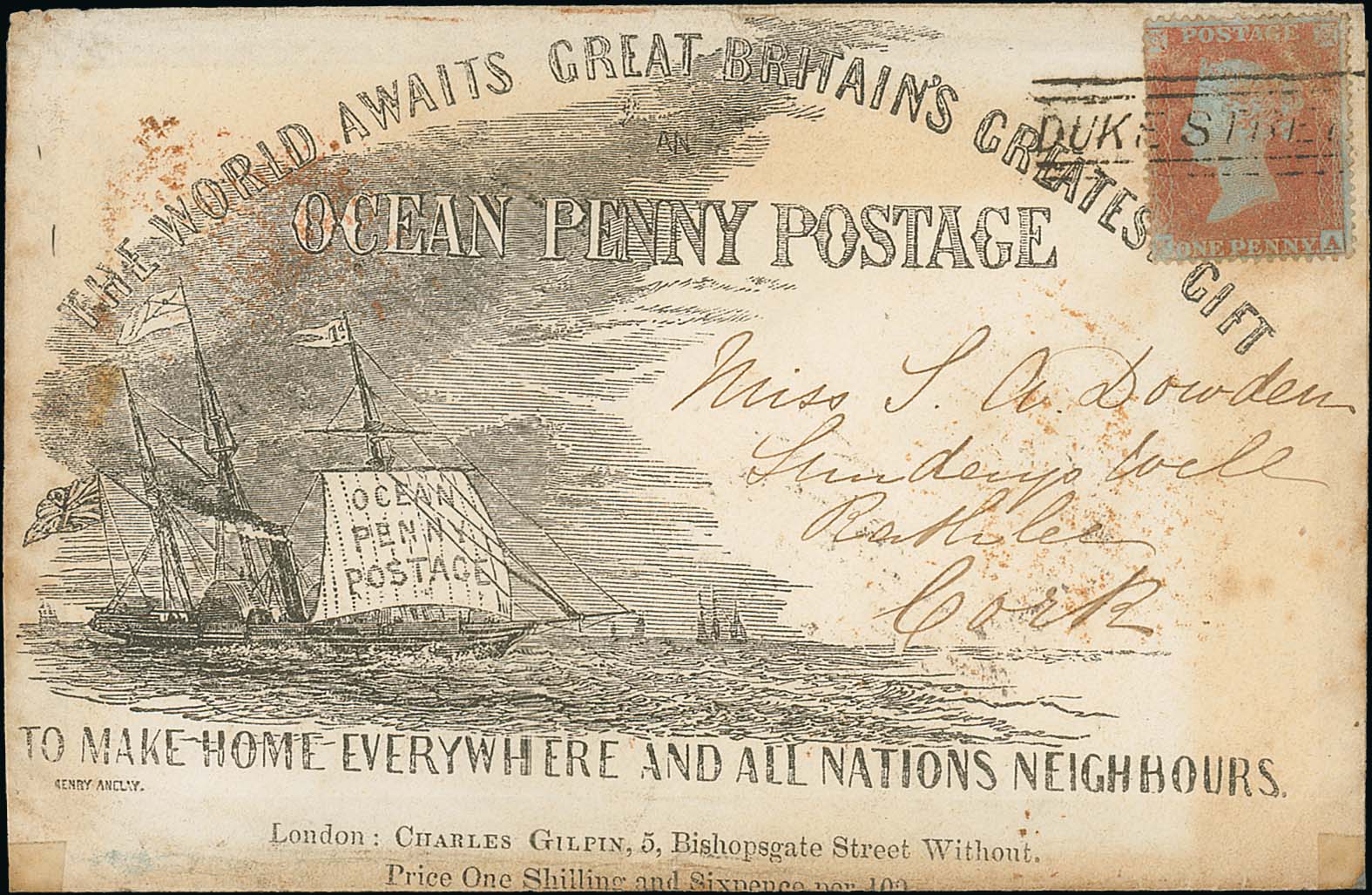 739 imageScots Local Cancels - Pictorial Envelope. 1854 (Nov 25) Ocean Penny Postage envelope published by Charles Gilpin, state 2, posted to Ireland with a 1d red cancelled by straight line "DUKE STREET" with two bars above and below, backstamped at Glasgow, Dublin and Cork. A little toned, opened out with edges strengthened internally, nevertheless an exceptional use with a Scots Local cancel, illustrated in "British Pictorial Envelopes" by Bodily, Jarvis & Hahn, ex. Charless Hahn. Photo on Page 100. (Image1)