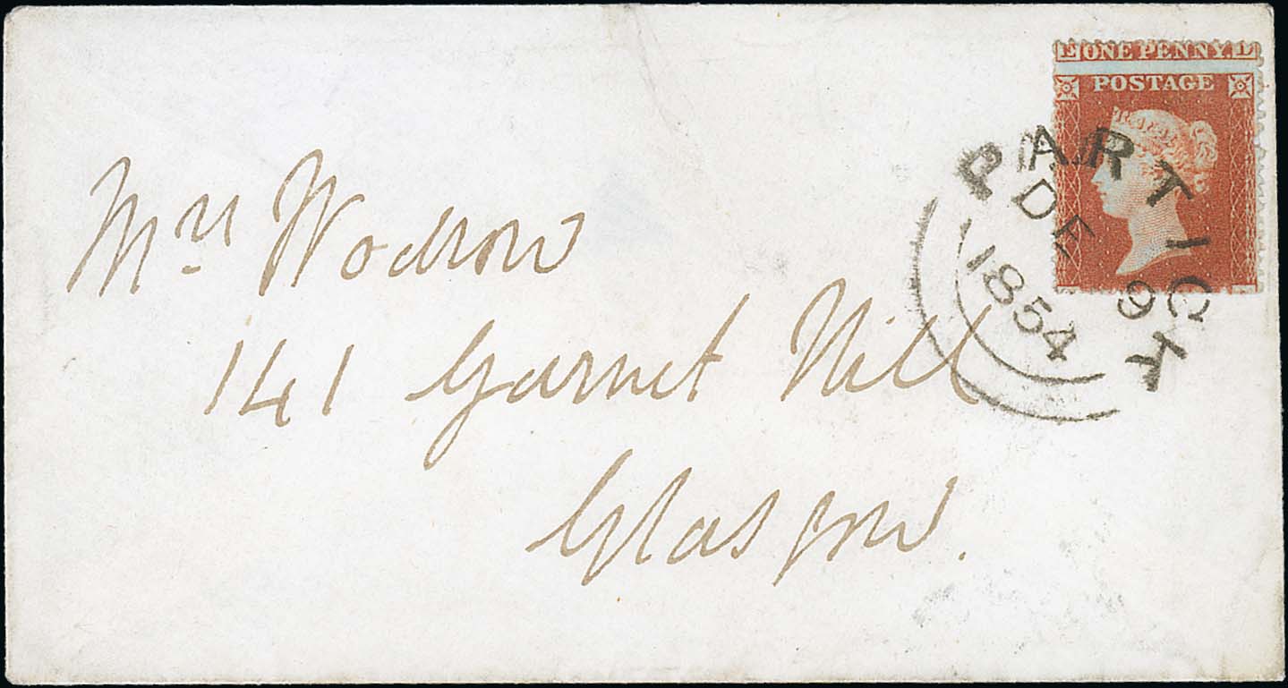 736 Scots Local Cancels. 1855 (Feb 21) Cover to London franked 1d red perf 16, watermark Small Crown die 1, unusually with double horizontal perforations, cancelled by superb boxed "HOPE / STREET". An unusual 1d variety on cover.