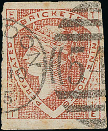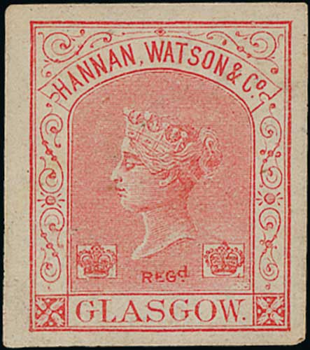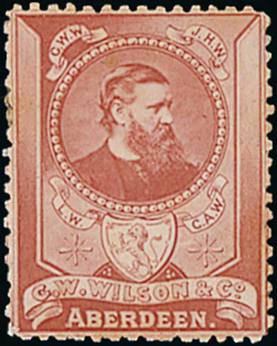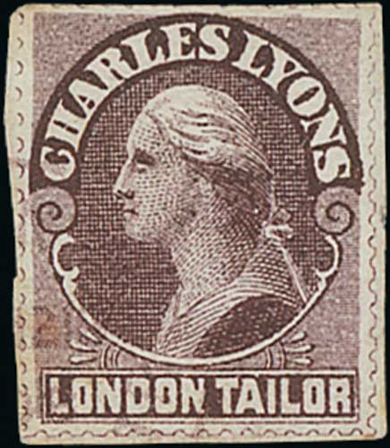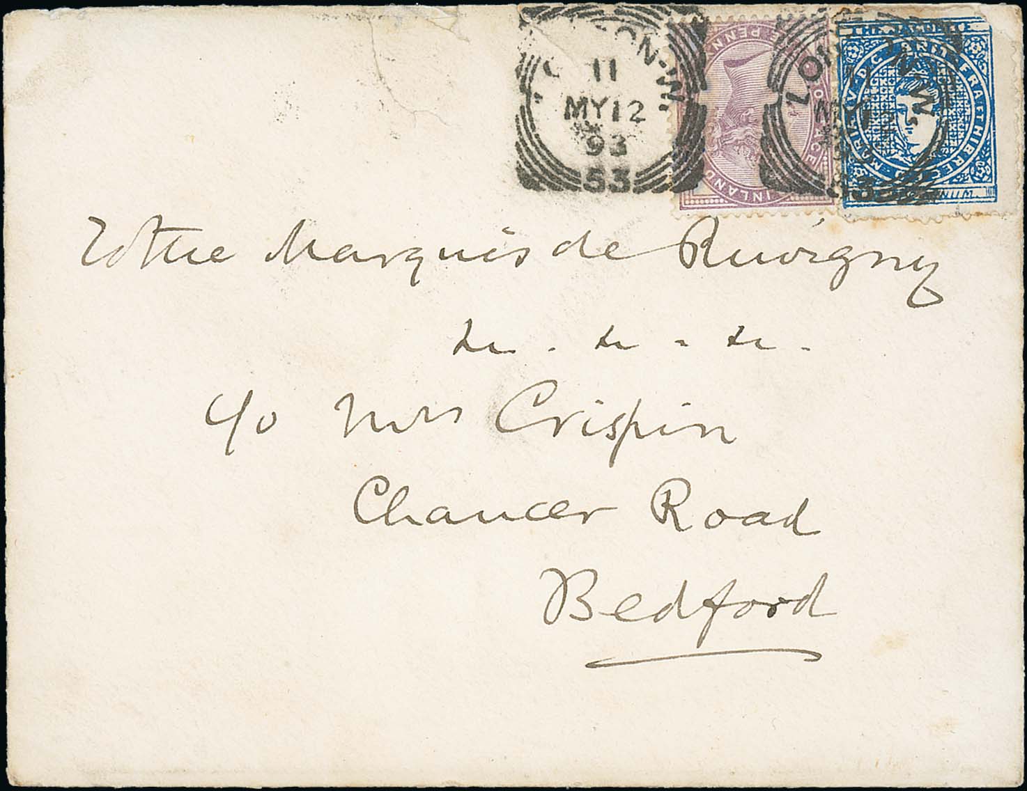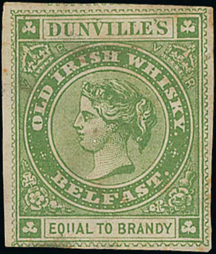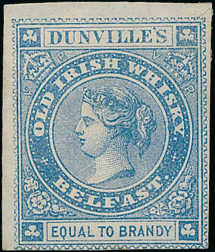 790 imageG.B - Ireland. 1869 (June 14) Cover with embossed Dunville & Co flap, posted from Belfast to Shrewsbury franked 1d tied by Belfast duplex, an advertising stamp for "Dunville s Old Irish Whisky, Belfast, Equal to Brandy" in violet in the upper left corner, also similar unused labels in green and blue, the cover with some staining but very scarce. (3). Photo on Page 16. (Image1) (Image2) (All Images)