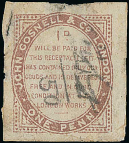 787 imageG.B. c.1875-90 Advertising labels with designs imitating postage stamps including "The Balloon, The New Farcical Comedy" (block of four), "Delia, Horace Guy s Opera company", "S.F Goss Limited Guarantee label" (2) and "John Gosnell & Co 1d paid for the return of empty receptacles to their London Works" (2) all in designs similar to the 1d lilac, others similar to 1d red or 1½d rose-red stamps, also a larger label for "The Garland, Every Wednesday" and an advert for Sunlight Soap both based on the 1d lilac stamp. A rare group. (17). Photo on Pages 24 & 32. (Image1) (Image2) (Image3) (Image4) (All Images)