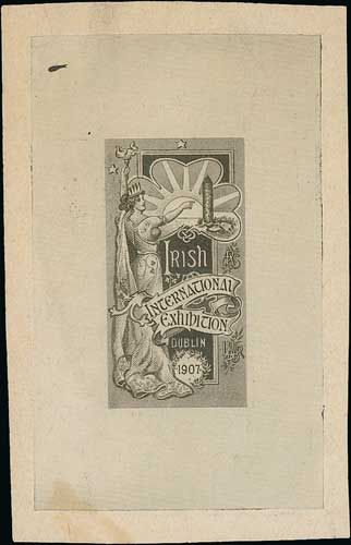 791 imageG.B - Ireland. 1907 International Exhibition Dublin, die proof of the type I stamp in black die sunk on laid paper, 59x93mm; also unused type I stamps (3, one overprinted for White Steam Packet Co. Cork) and type II stamps (4, re-engraved with "1907" in fancy script). A rare proof. (8). Photo on Page 30. (Image1)