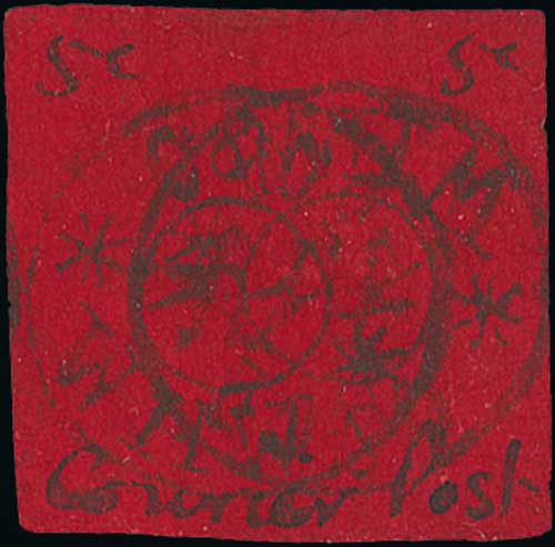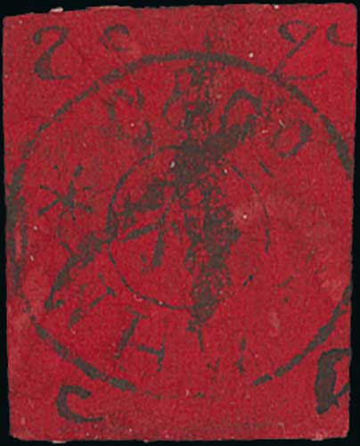 800 imageChina - Wei Hai Wei Courier Post. 1898 2c Black on scarlet used with manuscript cross cancel, and 5c black on scarlet unused, the 2c with a couple of tiny thins, the 5c fine and scarce with just 329 stamps printed. S.G. 1/2, £5,400. (2). Photo on Page 16. (Image1) (Image2) (All Images)