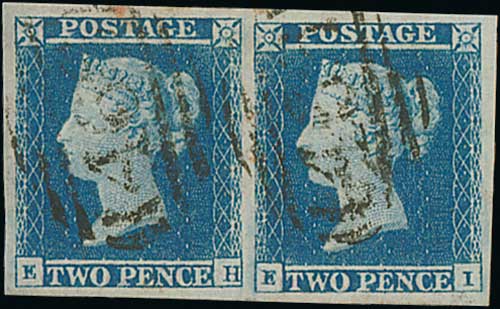 100 image1851 2d Violet blue, EH-EI plate 4 pair on thicker lavender tinted paper, used with huge margins, very scarce so superb. With B.P.A Certificate (1977). S.G. £3,000+. Photo on Page 12. (Image1)