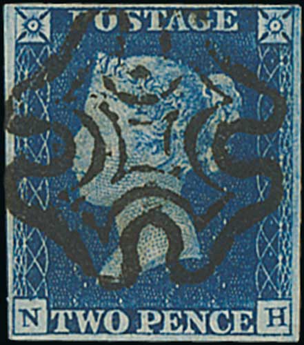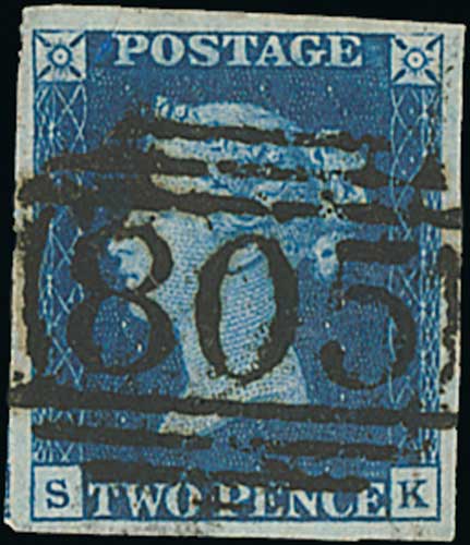 85 image1840 2d Blue, SK plate 2 with large margins, used with numeral cancel "805" of Torquay, a late use with this cancel (introduced in 1844), rare so fine. S.G. £2,000. Photo on Page 12. (Image1)