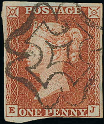 91 image1842 1d Red-brown, EJ plate 30, good to large margins, with a virtually complete strike of the distinctive Channel Islands Maltese Cross in black, rare this fine. With B.P.A Certificate (18994). S.G. £7,500. Photo on Page 12. (Image1)