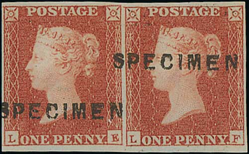 94 image1849 1d Red-brown plate 90, LE-LF pair each handstamped "SPECIMEN" type 1, good to large margins, unmounted mint original gum, exceptional quality. S.G. BS79s, £4,000+. Photo on Page 12. (Image1)