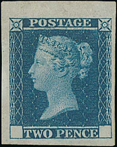 97 image1841 2d Blue trial printing without letters in the lower corners, large margins, partial upper margin, very fine. S.G. DP43, £1,500. Photo on Page 12. (Image1)