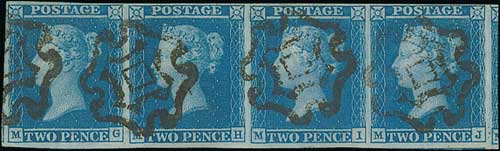 98 image1841 2d Blue plate 3, MG-MJ strip of four all with good to large margins, each with the distinctive Maltese Cross cancel of Norwich in black, scarce on the 2d value, especially in a multiple such as this. S.G. £5,200 as singles. Photo on Page 12. (Image1)