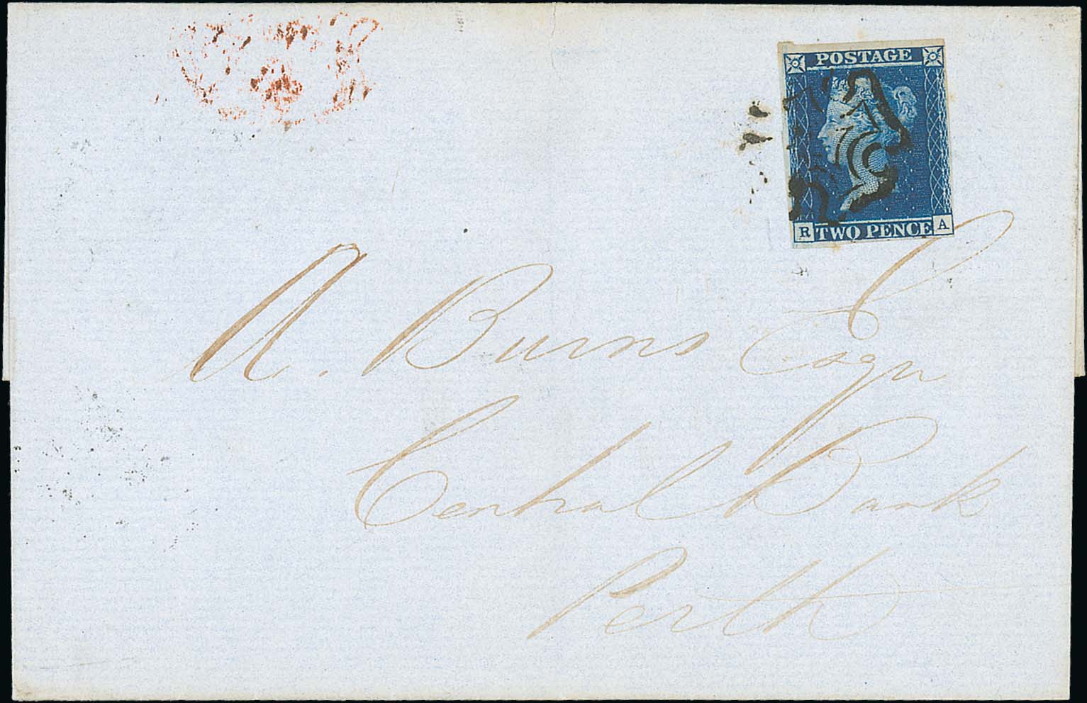 99 image1841 (Dec 21) Entire from London to Perth bearing 1841 2d blue RA plate 3 (four margins) tied by a black Maltese Cross, this plate 3 2d very rarely seen used in 1841, fine, with R.P.S Certificate (2002). Photo on Page 14. (Image1)