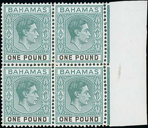 987 image1938 £1 Deep grey-green and black on thick paper, marginal block of four, lightly mounted in the margin and on the upper left stamp, the others unmounted, very fine, ex Lord Steinberg. S.G. 157, £1,000. Photo on Page 134. (Image1)