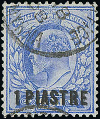 1029 image1905-08 1pi on 2½d Ultramarine, variety surcharge double, used with 1908 Smyrna c.d.s. A great rarity, this stamp the discovery example and the basis of the part 1 listing. With David Brandon Certificate (1993) as S.G. 13 variety. S.G. 13a, £2,000. Photo on Page 108. (Image1)
