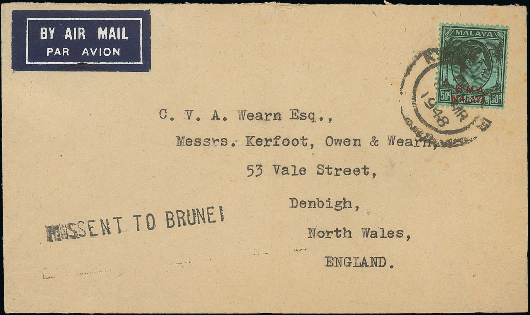 1032 image1948 (Mar 8) Air Mail cover from Kuala Lumpur to Wales franked BMA 50c, handstamped straight line "MISSENT TO BRUNEI", not recorded by Proud (the only recorded Missent handstamp not used until 1969), very rare. Photo on Page 132. (Image1)