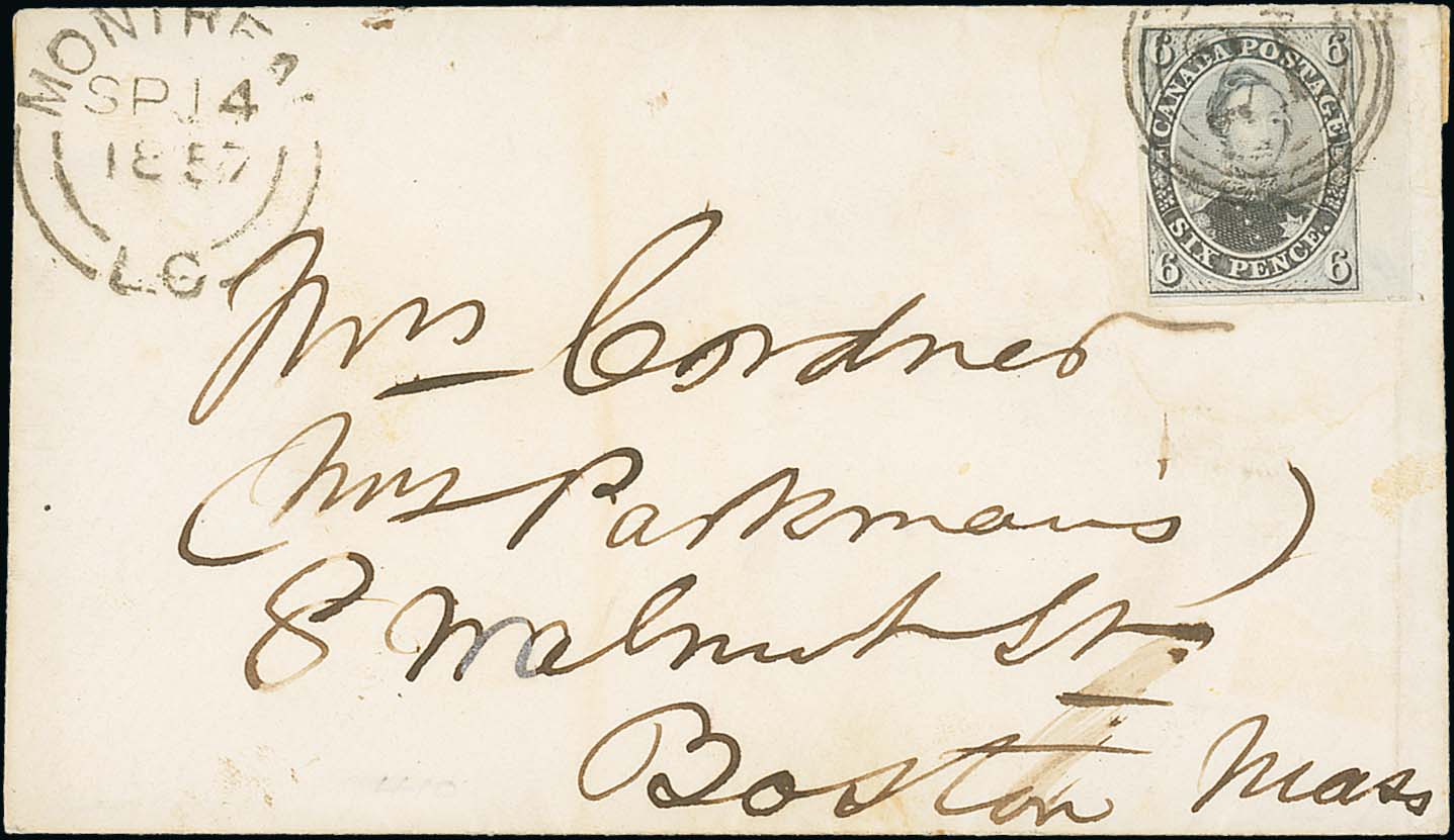 1034 image1845-58 Entire letters and entires comprising stampless letters to U.S.A with red "PAID / AT / QUEBEC L.C" crowned circles (2) or to Montreal with red "STEAMBOAT LETTER / QUEBEC" datestamp (2), printed circular franked ½d (not tied but appears to belong), entires franked 3d (4, one with Steamboat Letter Quebec datestamp), and 1857 (Sep 14) cover from Montreal to Boston with 1857 6d grey-lilac tied by circular "21" numeral, a few stamp faults, the 6d touched at top. (10). Photo on Page 132. (Image1)