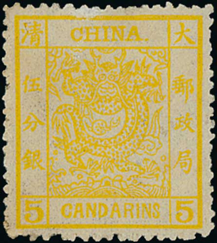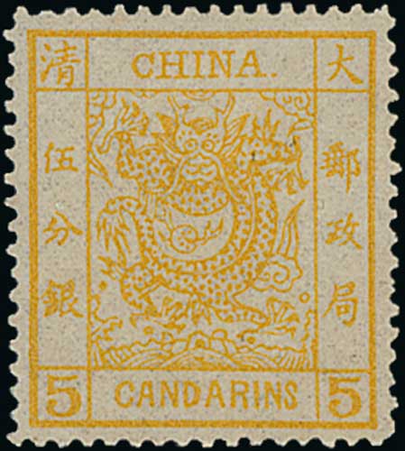 1042 image1878 Large Dragon 5ca yellow, 2½mm spacing on thin paper, fine mint. S.G. 3a, £1,800. Photo on Page 108. (Image1)