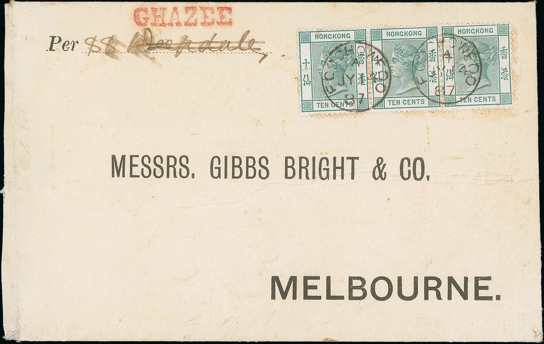 1046 image1887 (July 14) Cover to Melbourne per S.S Ghazee franked Hong Kong 10c blue-green strip of three with central "FOOCHOWFOO" datestamps, Melbourne backstamp, flap missing, otherwise fine and a scarce 30c rate to Victoria. With B.P.A Certificate (2025). Photo on Page 132. (Image1)