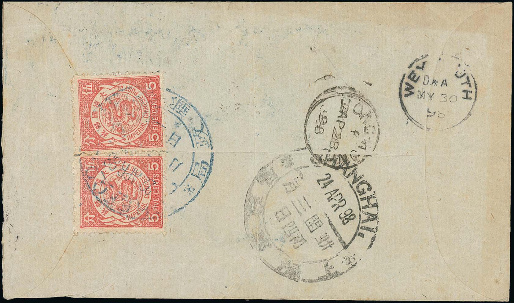1047 image1898 (Apr 22) Cover to England, the reverse bearing China 5ca (2) tied by blue Chefoo dollar chop datestamp, similar Shanghai c.d.s alongside, the front with Hong Kong 10c tied by c.d.s (Apr. 25), Hong Kong and Weymouth backstamps. Vertical fold, otherwise fine, a good combination cover, with B.P.A Certificate (2025). Photo on Page 132. (Image1)