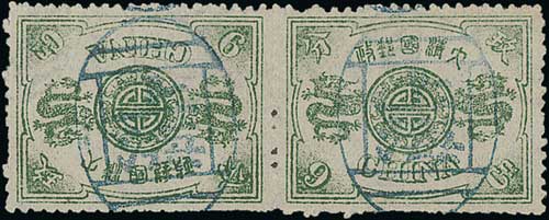 1048 image1894 60th Birthday of Empress Dowager (first printing), 9ca dull green horizontal tete-beche pair used with two neat Shanghai seal cancels in blue, a few trimmed perfs, otherwise fine and very scarce. S.G. 22d, £4,000. Photo on Page 108. (Image1)