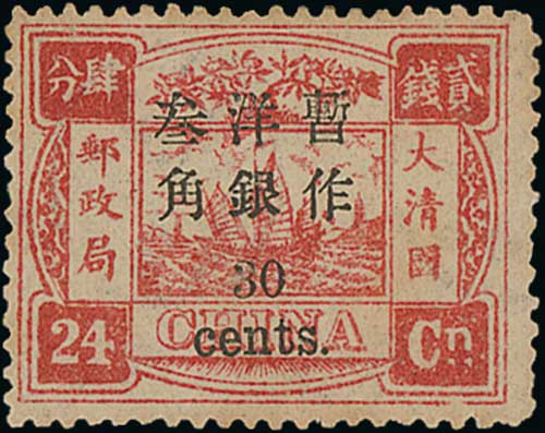 1044 image1883 Large Dragon 1ca green, 3ca brown-red and 5ca chrome-yellow, 2½mm spacing on thicker paper, rough perfs, 3ca unused without gum and minor toning, 1ca and 3ca fine mint part original gum. S.G. 7/9, £3,550. (3). Photo on Page 108. (Image1)