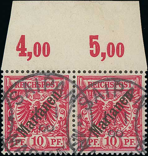 1237 imageMariana Islands. 1899 10pf Carmine pair with 48‚àû overprints, upper margin showing "4,00" and "5,00" values, used with 1900 (Jan. 1) Saipan datestamps. S.G. 3, £600+. Photo on Page 152. (Image1)