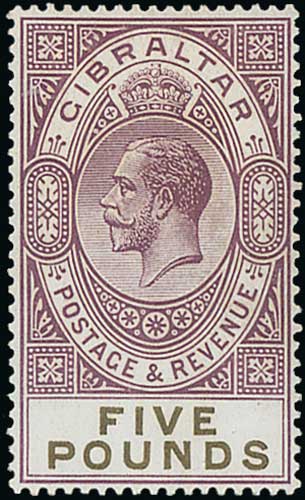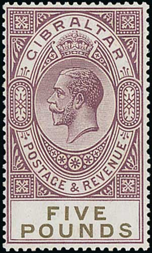 1242 image1925 £5 Violet and black superb mint, ex. Sir Gawaine Baillie. S.G. 108, £1,600. Photo on Page 152. (Image1)