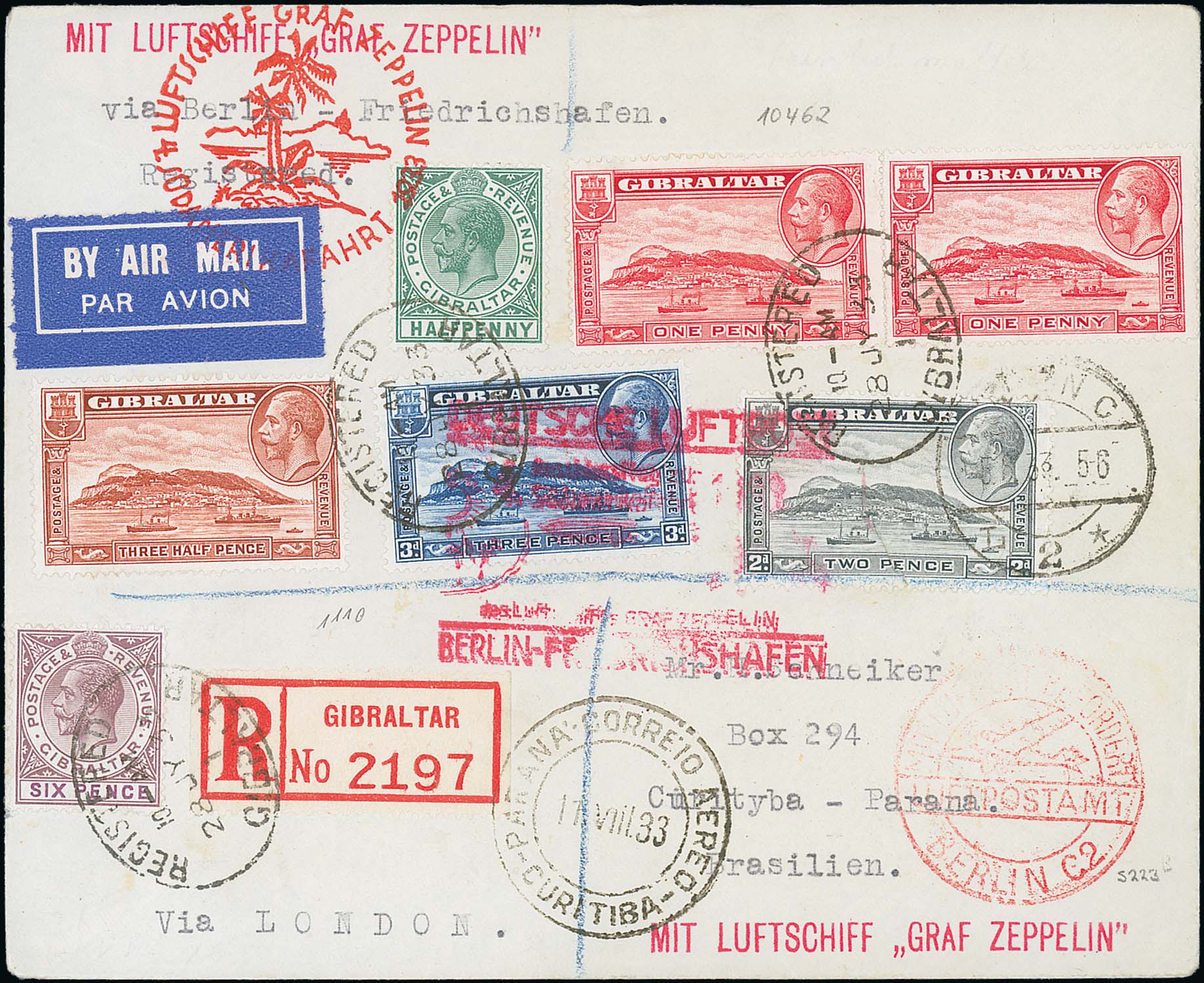 1243 imageZeppelins / Air Mails. 1933 (July 28) Registered cover from Gibraltar to Brazil franked 1/3, carried by special flight from Berlin to Friedrichshafen and then on the Graf Zeppelin 4th South American flight, cachets of both flights, backstamped at Parana (Aug 11). Also 1932 cover from Gibraltar to the Imperial Economic Conference in Ottawa, carried on the special flight from London, with Gibraltar, G.B and Canada stamps. (2). Photo on Page 144. (Image1)