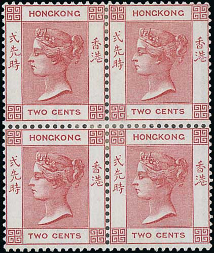 1254 image1880 2c Rose-lake, mint block of four, light horizontal crease through lower pair, small hinge remainders, an attractive and scarce block. Ex. George Dyer. S.G. 28a, £1,200+. Photo on Page 134. (Image1)