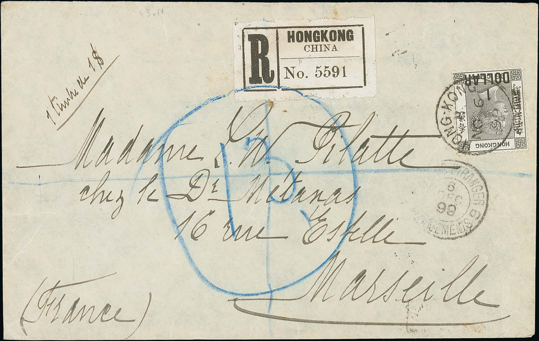 1256 image1899 (Nov 6) Registered cover to Marseille bearing scarce first type black "R / HONGKONG / CHINA" registration label (recorded Nov 1899 - April 1900) and franked 1898 $1 on 96 (S.G. 52), paying the nine times rate + registration, backstamped at Paris and Marseille. Small piece cut from flap, otherwise fine. A rare single use of this $1 stamp and the earliest recorded use of a Hong Kong registration label. Photo on Page 154. (Image1)