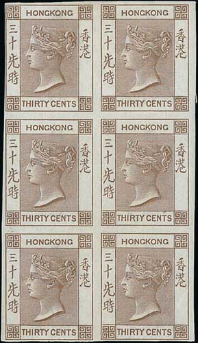 1257 image1901 30c Brown imperf plate proof block of six (2x3) on gummed Crown CA paper, lower right stamp creased, otherwise fine and very scarce. Photo on Page 130. (Image1)