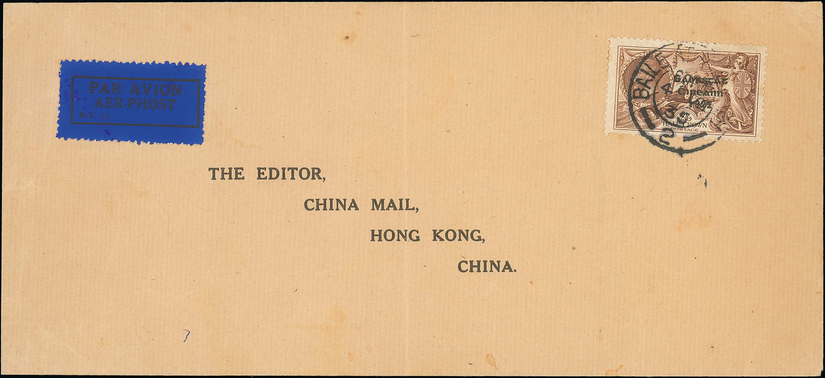 1258 image1935 (July 4) Air Mail cover from Dublin to Hong Kong, China, franked Ireland 2/6 Seahorse, flown from Croydon to Singapore on "Satyrus" I.E355, delayed by bad weather at Karachi and again at Allahabad by head winds. The 1oz air rate to Hong Kong was 2/5, an additional 1d air fee charged on letters addressed "China". Fine and very scarce from Ireland. Photo on Page 154. (Image1)